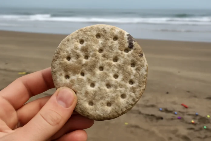 Biscoito das Filipinas encontrado intacto em praia de Peruíbe, SP, comido por monitor ambiental, revela fluxo de lixo marinho e alerta para conservação