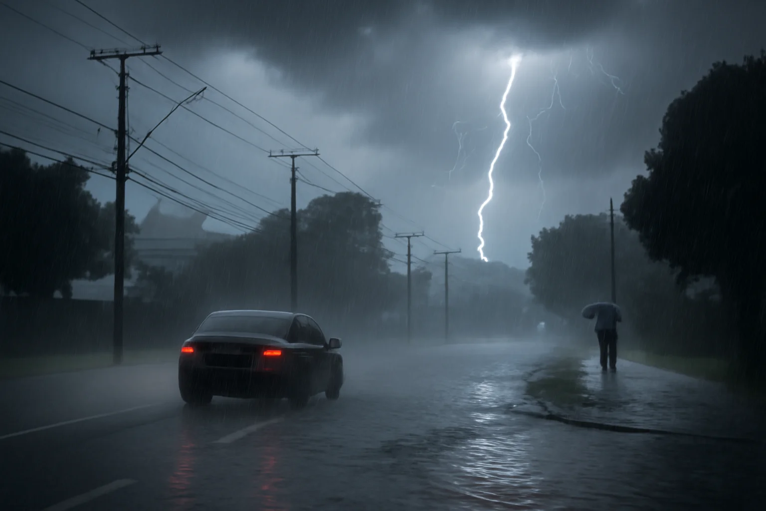 Rajadas de vento elevadas podem causar queda de árvores e danos a estruturas frágeis, por isso é importante evitar áreas expostas e estacionar longe de torres e placas.
